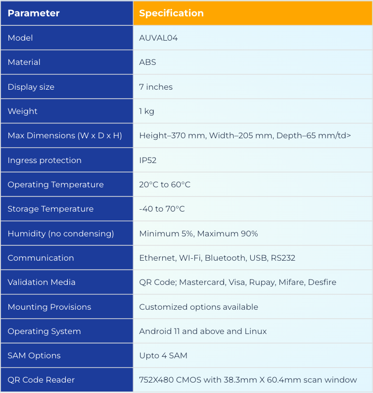 The AUVAL04 Fare Collection Gate Validator by Aumnatic is designed to offer a reliable and flexible solution for fare collection and access control. With its multiple validation methods, efficient recovery, and customization options, it’s well-suited for modern transit and access systems.