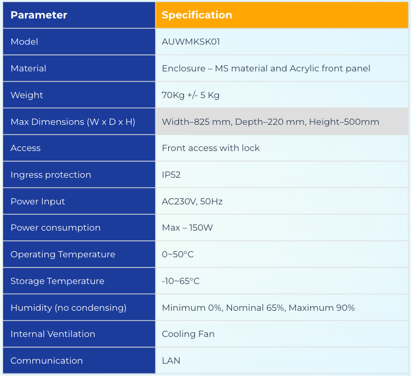 | Max Dimensions (W x D x H) | Width–825 mm, Depth–220 mm, Height–500mm |